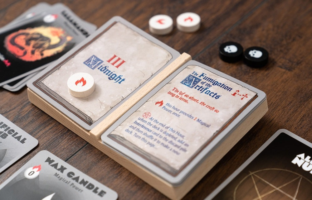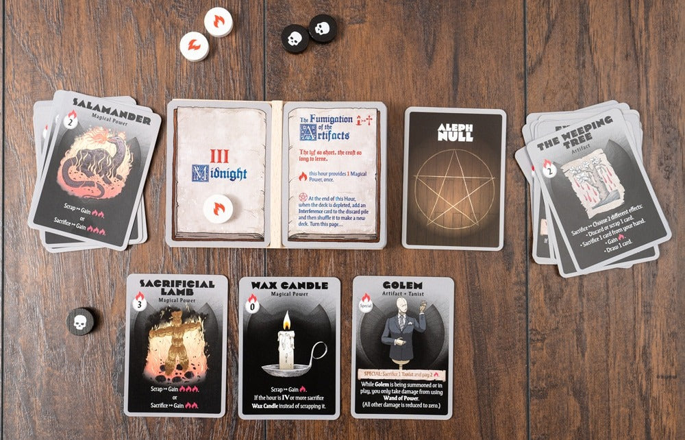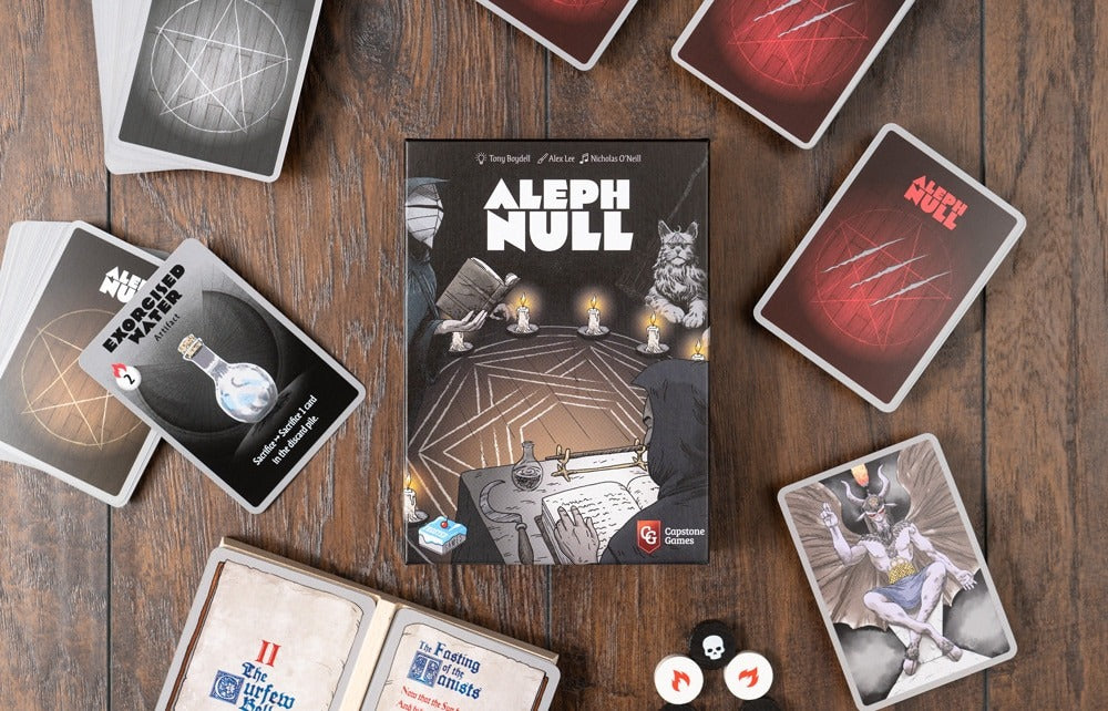 Inspired by the Black Easter novellas by James Blish, the aim of Aleph Null is to successfully summon the demonic Prince Baphomet who, when he appears, expects there to be no cards in your hand, the main deck and the discard pile; if there are any cards remaining in these zones, you lose. However, not losing in this way doesn't mean that you have won: any cards still in play also count against you too many and you shall lose also. The sooner you win, the better your chance of surviving any due punishment.