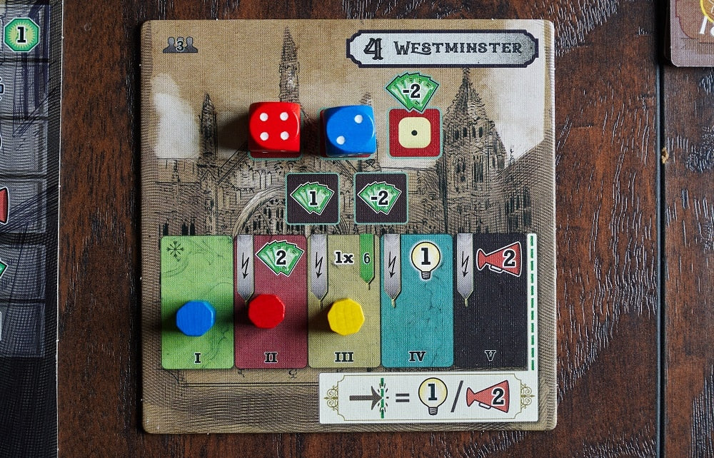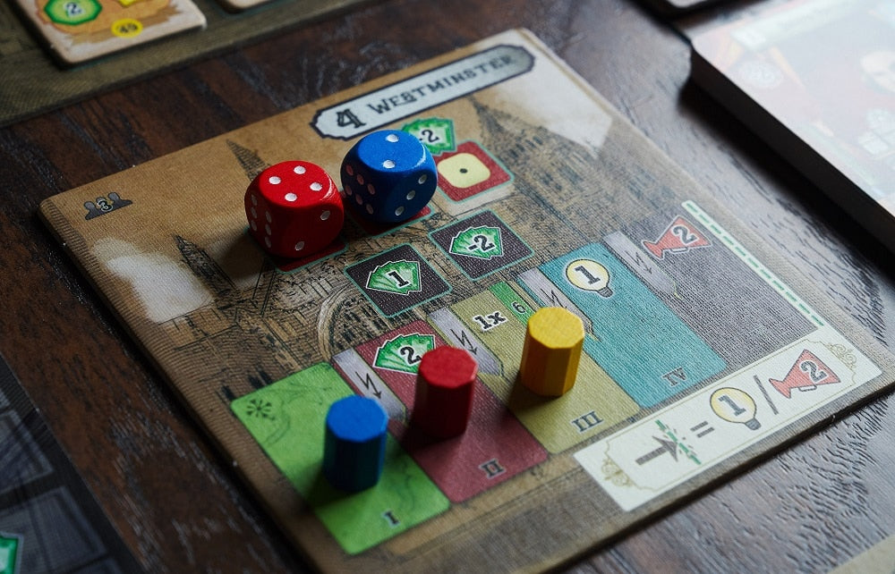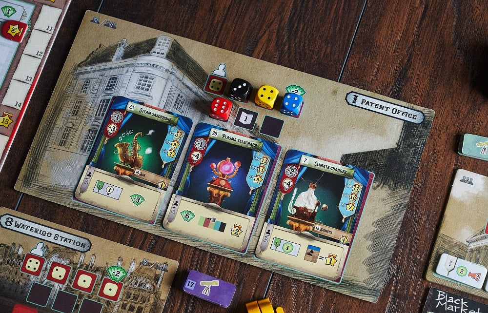 Crystal Palace is a dice-placement game in which the players themselves determine the stats of their dice at the beginning of each round. The higher the number, the better — but it comes at a price. In the course of the game, dice are placed on eight action locations (Patent Office, Reform Club, London Times, Port of London, Waterloo Station, British Museum, Bank of England, Westminster) in a competition for the best resources, patents, and brains.