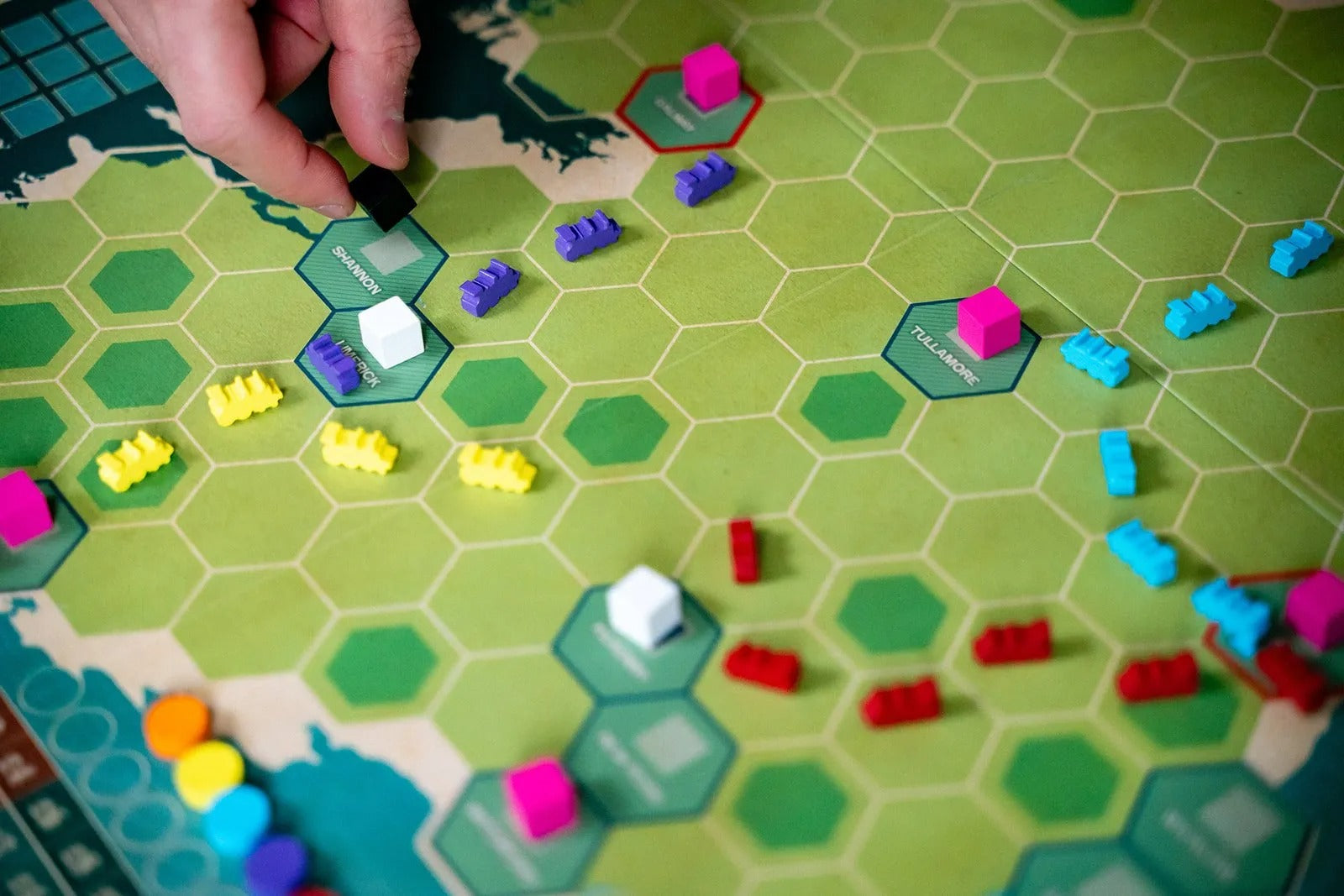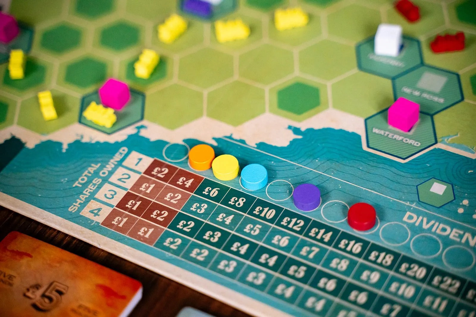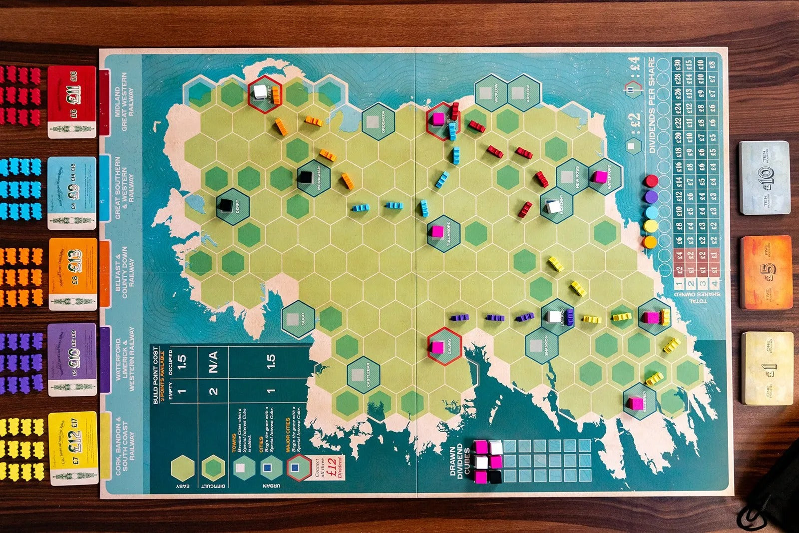 Irish Gauge is a game about building the railroads across Ireland. Savvy investors leverage their special interests to bring the railroads to their businesses. Irish Gauge is a game of simple rules with varied strategies & tactics for 3-5 players ages 12 and up, playing in about an hour.