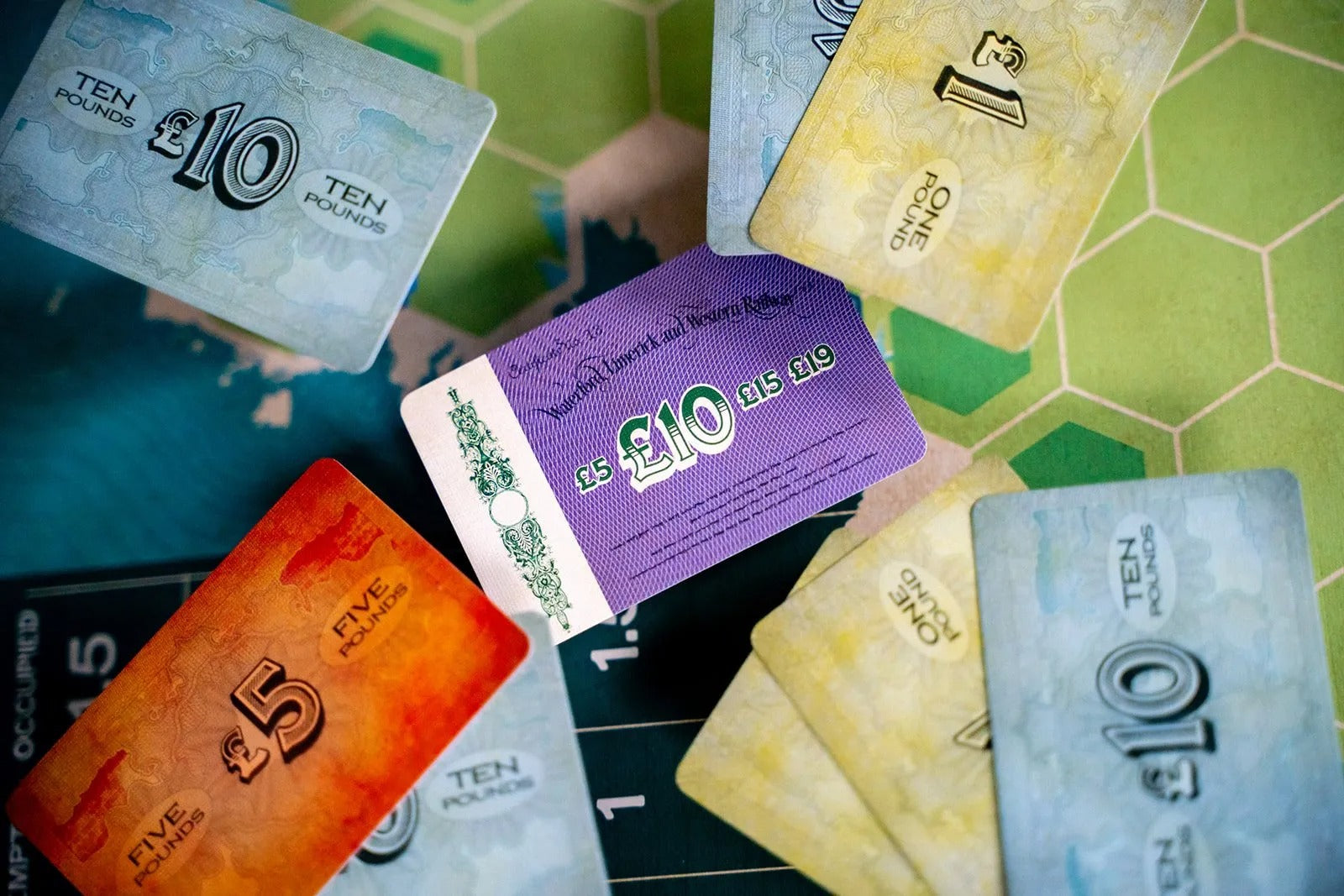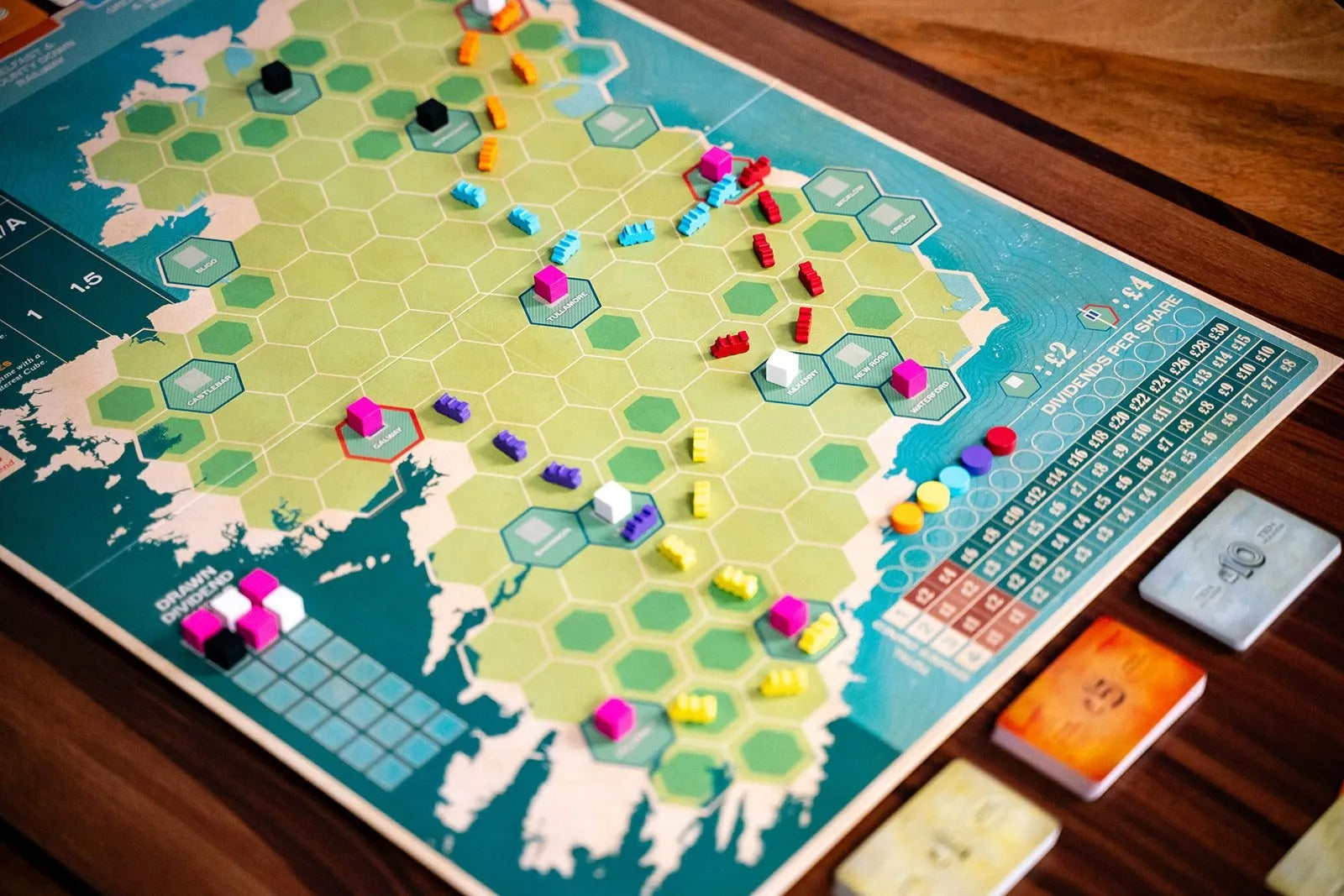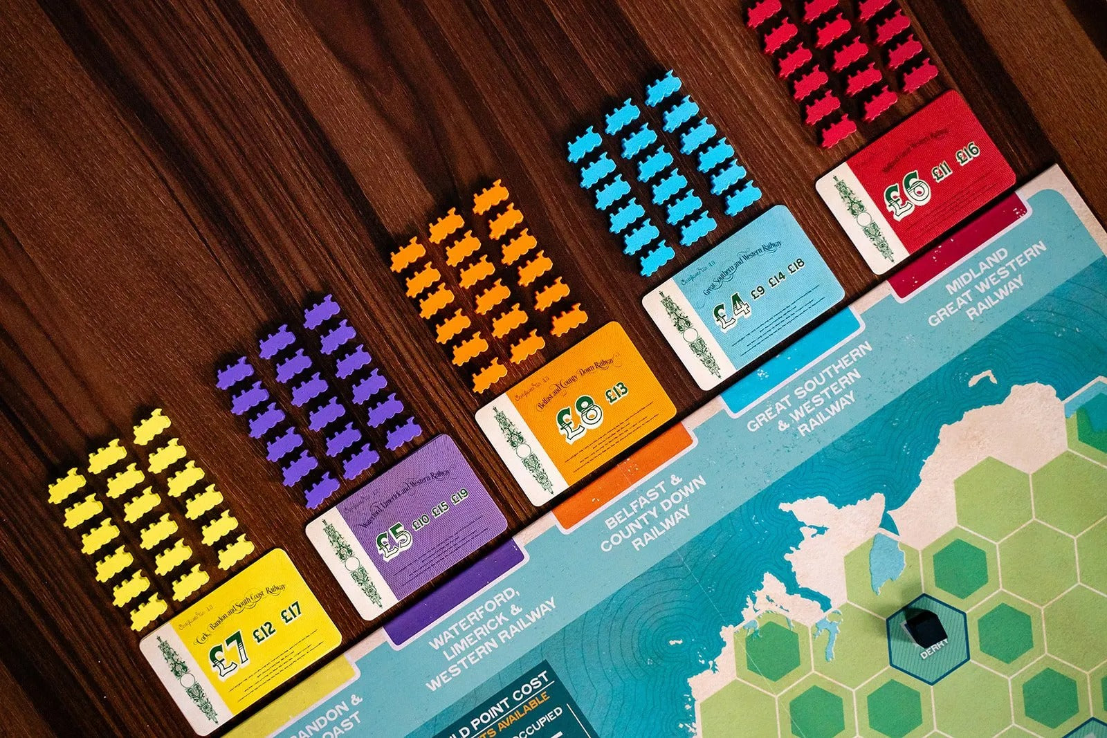 On your turn, you may either auction a share of any available company, build railway track in one of the companies, upgrade a small town to a city, or request dividends to be paid. Upgrading towns and requesting dividends affect the length of the game as well as the likelihood of companies paying dividends in the future. The game will end when a certain condition is met. The player with the most money plus stock value wins the game! Irish Gauge is the inaugural title in the Iron Rail series.