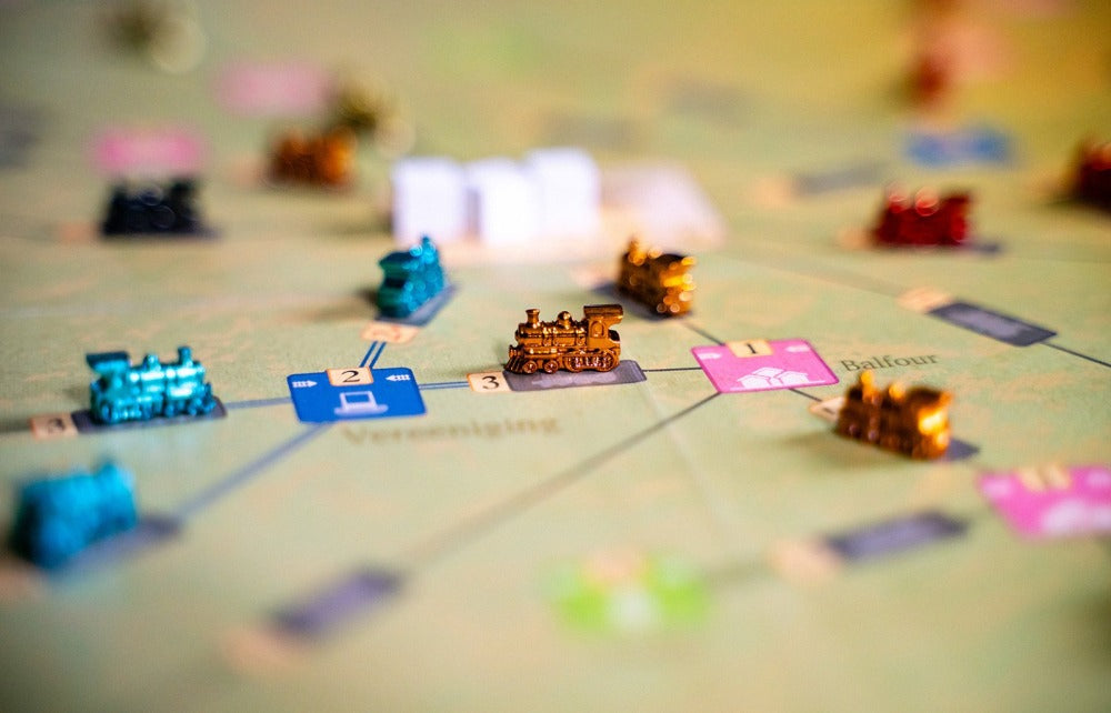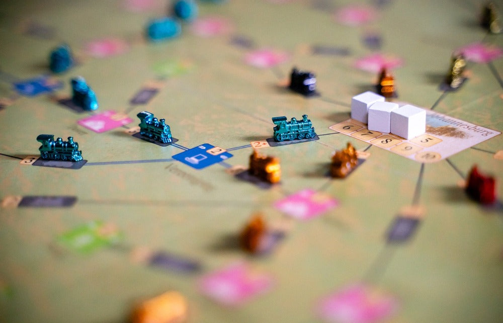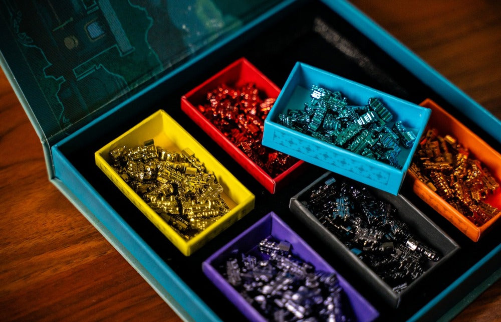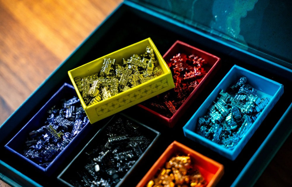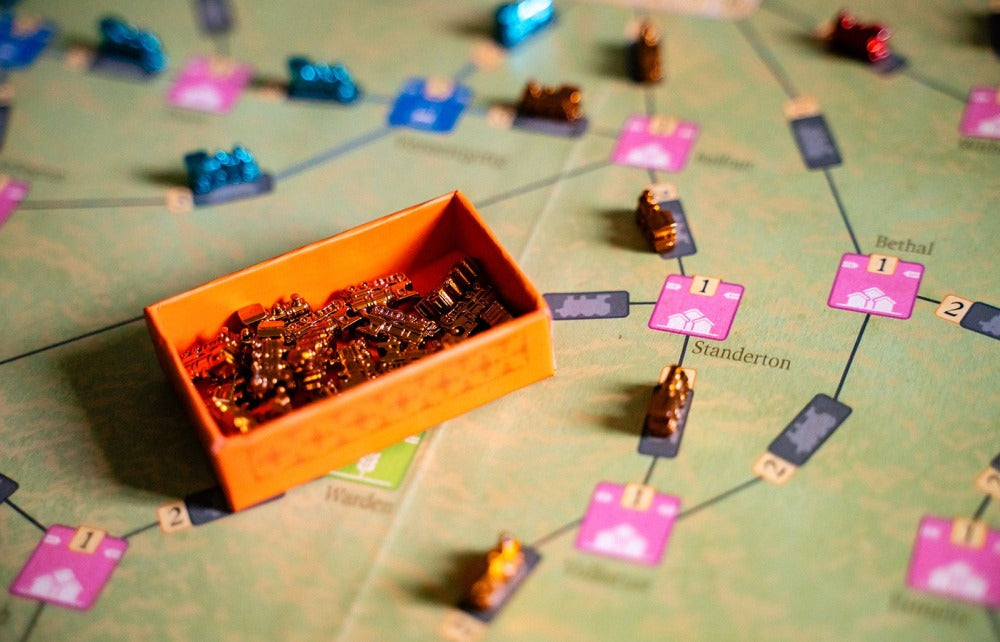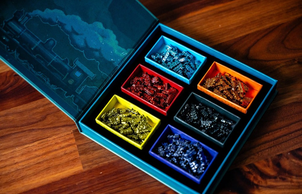 This upgrade includes 180 metal trains, 30 in each train color, offering tactile delight and visual appeal. The set includes an artfully crafted storage box, complete with removable train boxes for easy setup and tear down for any Iron Rail game!