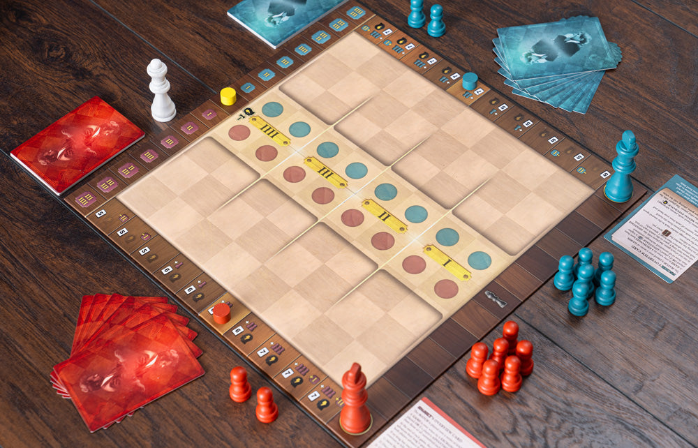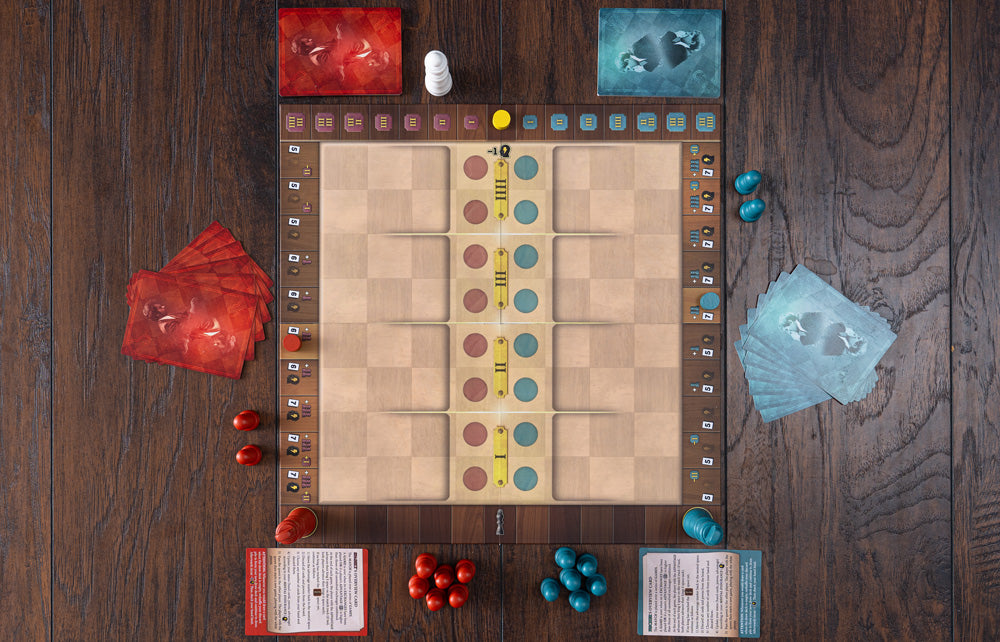 In Match of the Century, you play one another over a series of games, just as in a real championship match. However, here each game lasts only a few short and intense turns, so every decision counts in pulling off the win. As you play cards with unique effects from your asymmetric decks, each of you manipulates the mental endurance of the other and the outcome of each quick game, but weigh your options carefully because only by giving up the advantage can you use the effects of your cards.