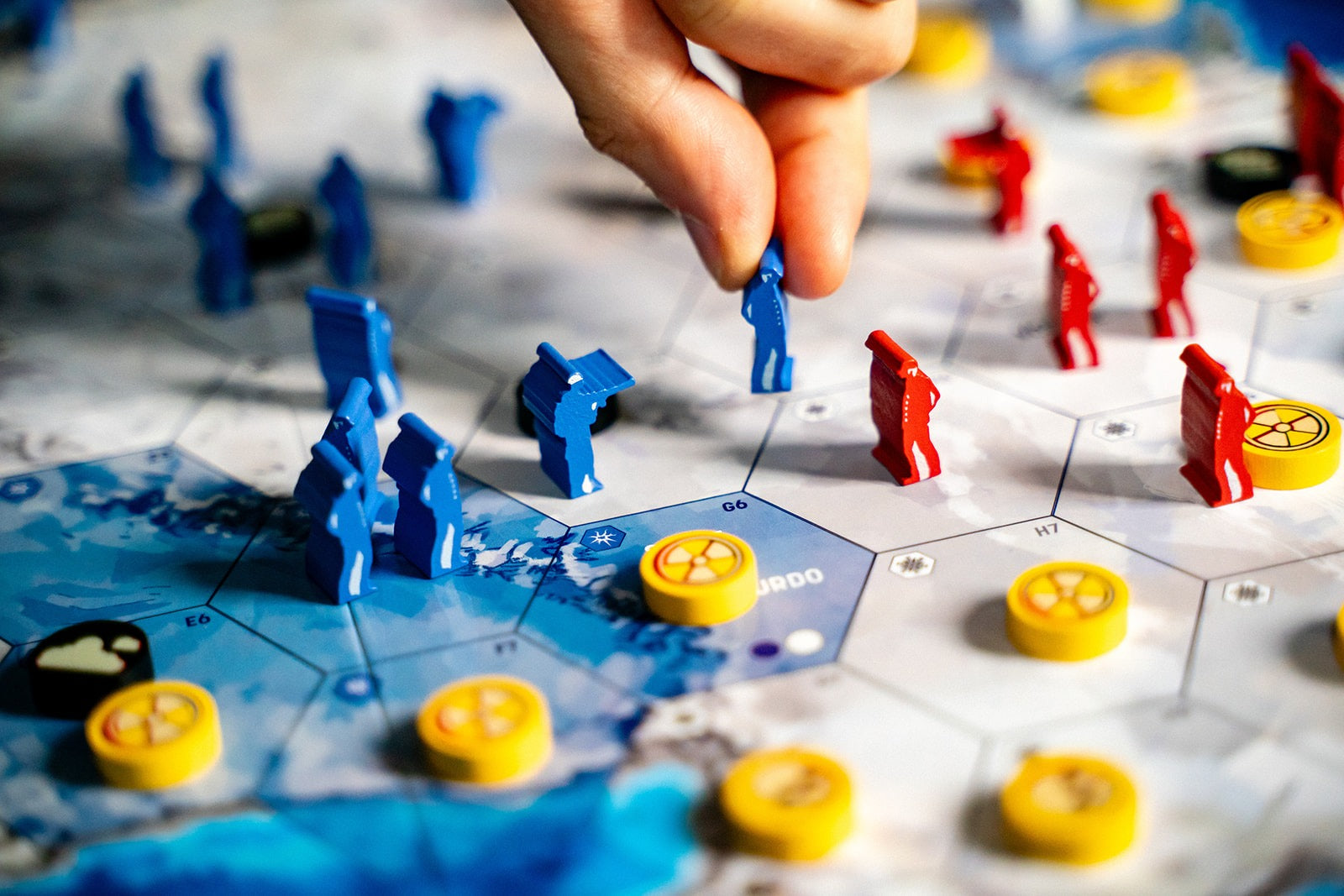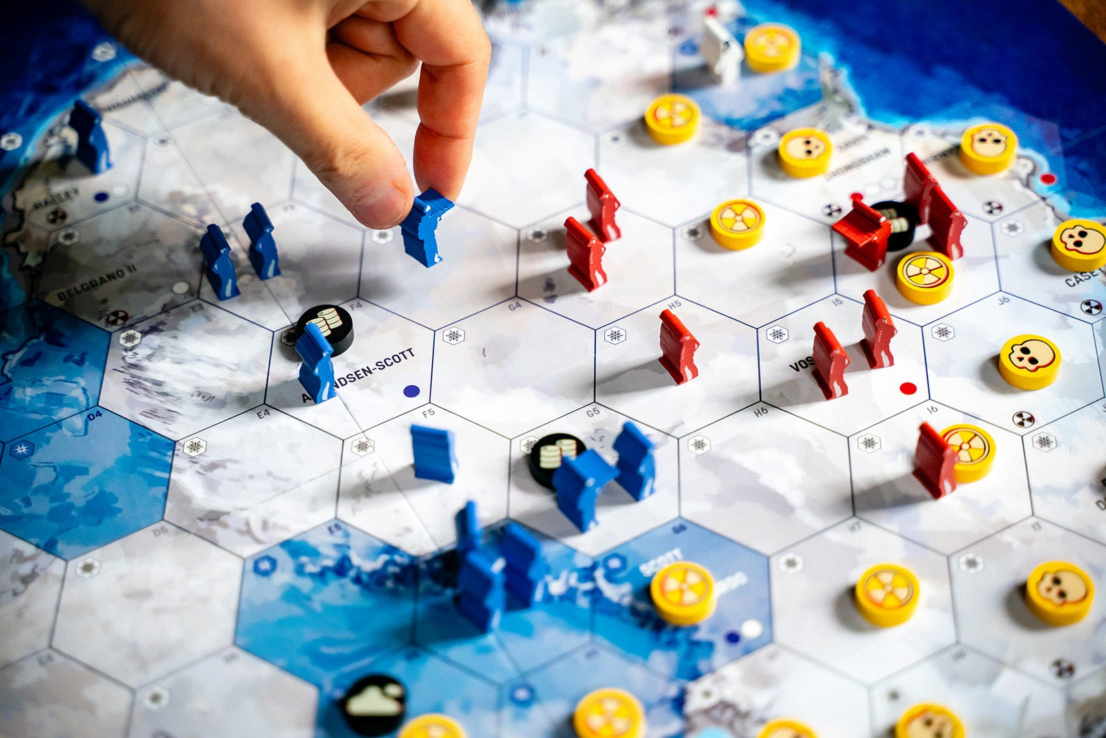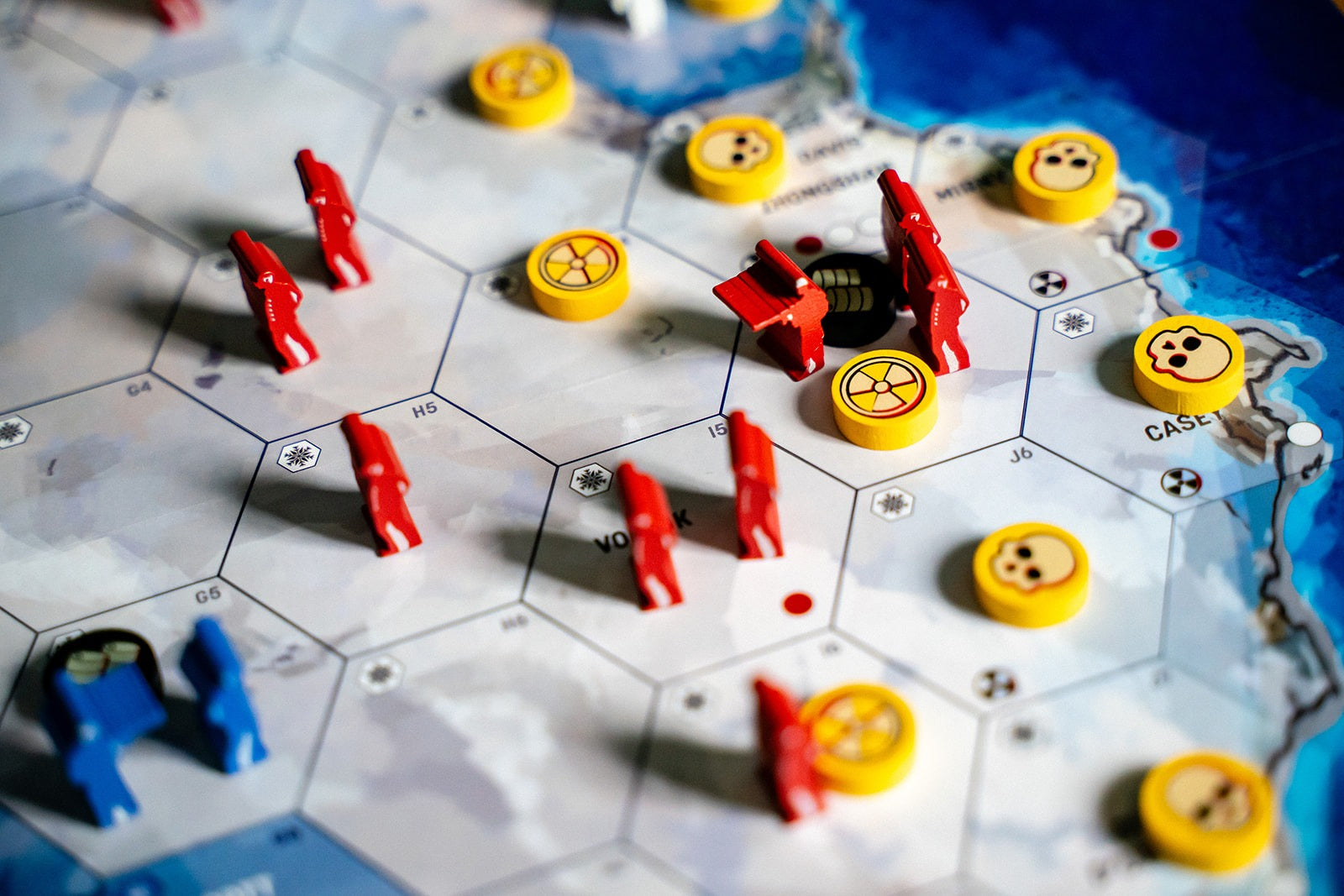 In Meltwater, 2 players command the shattered remains of the superpowers, struggling for control of the ice. Simple diceless mechanics let players displace, corner, and isolate their opponent’s survivors. Here, hunger is a crueler weapon than gunfire, and the barren tundra can only support so many souls. And every turn, radioactive contamination pushes in from the coastline, shrinking the available space and forcing the belligerents closer and closer together.
