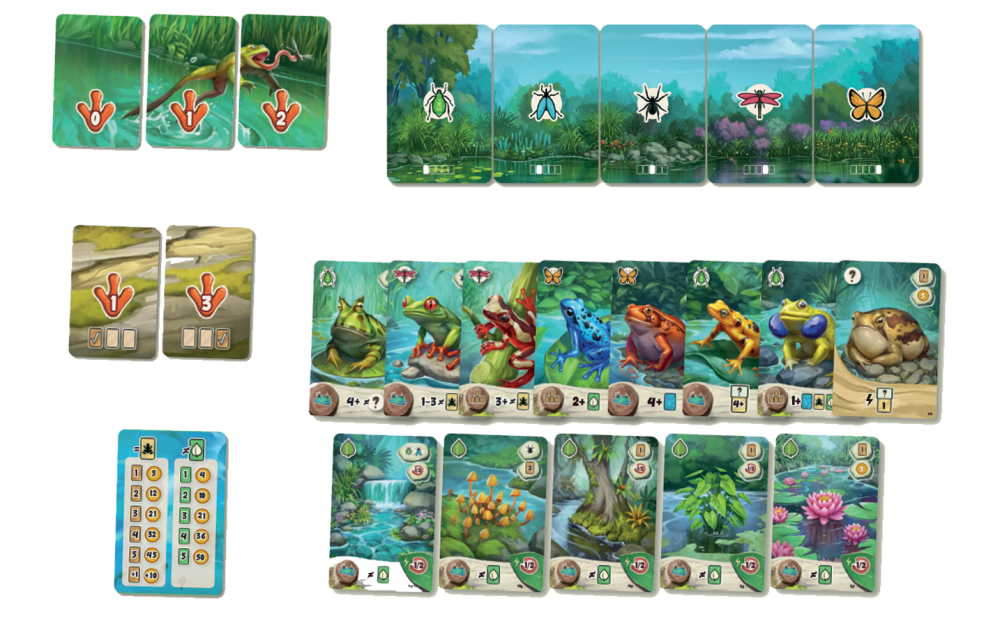 Pondscape is a card game where 1 to 4 players engage in the serene activity of building their own vibrant aquatic ecosystems. The core objective is to strategically populate their pond with diverse frog species and their preferred environments. Success hinges on forming specific groups of frogs that meet predefined conditions, which then yield valuable scoring points.