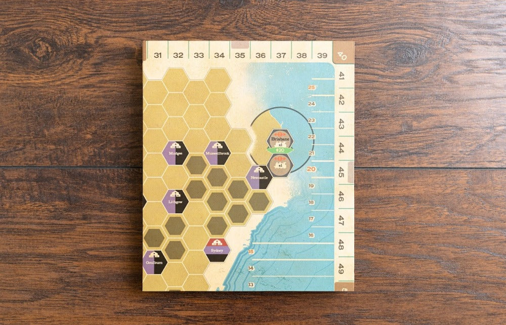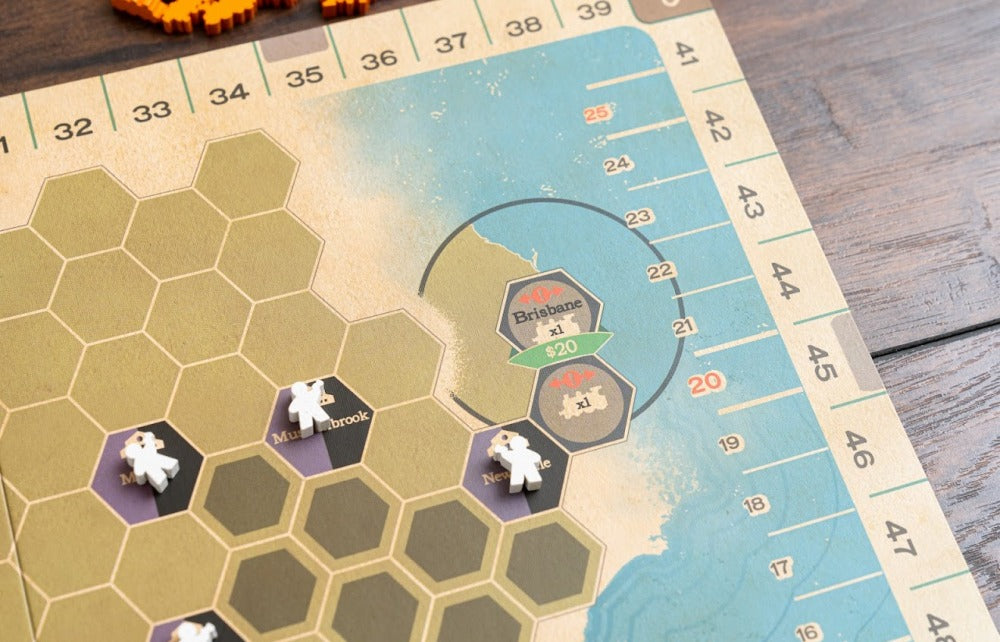 In Australia, new Long Distance hexes are available to connect far away cities which provide massive bonuses. The rugged terrain reduces your build capacity even further!