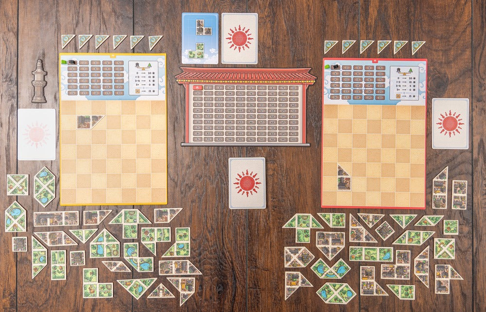 In Tangram City, you place city tiles on your board using secret information about what city tile will come up next. As the city tiles are double-sided, plan your layout with the goal of harmony and the shape of a rectangle in mind. At the end of a round, you receive points for the largest rectangle on the board, and at the end of the game, bonus points for harmony between the realms.