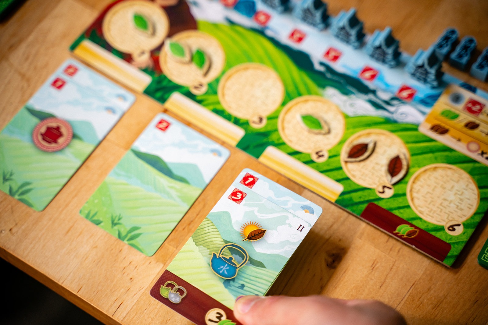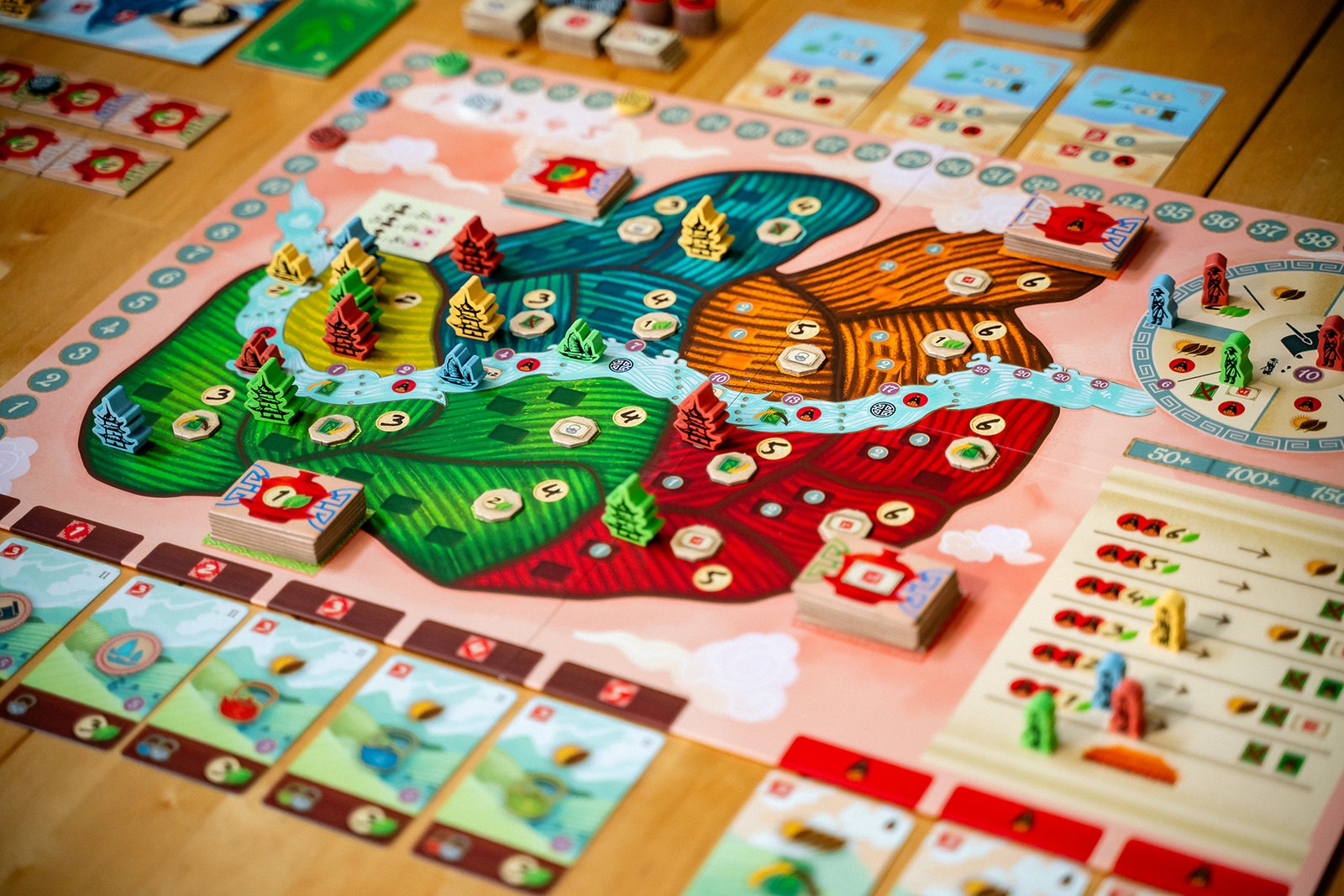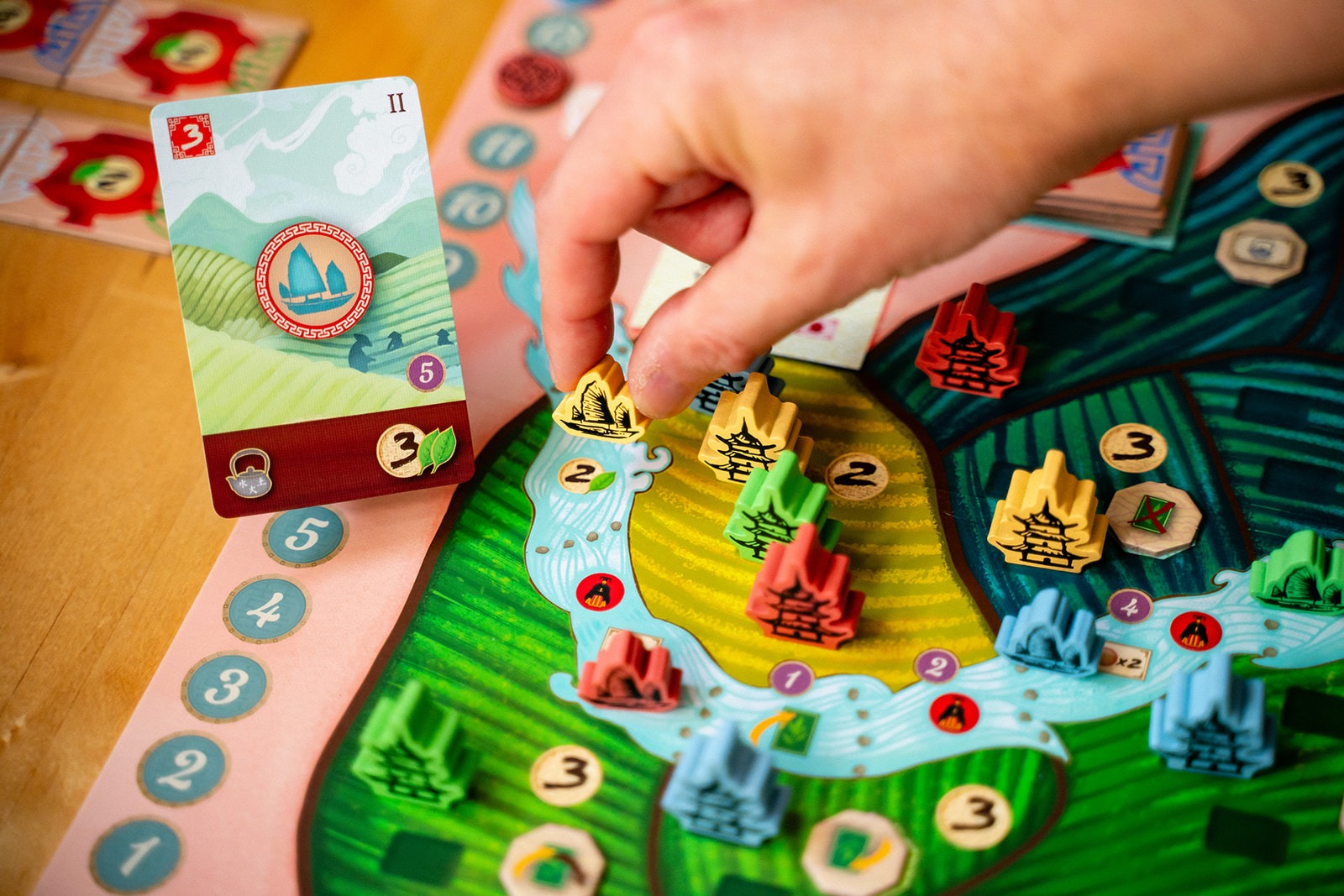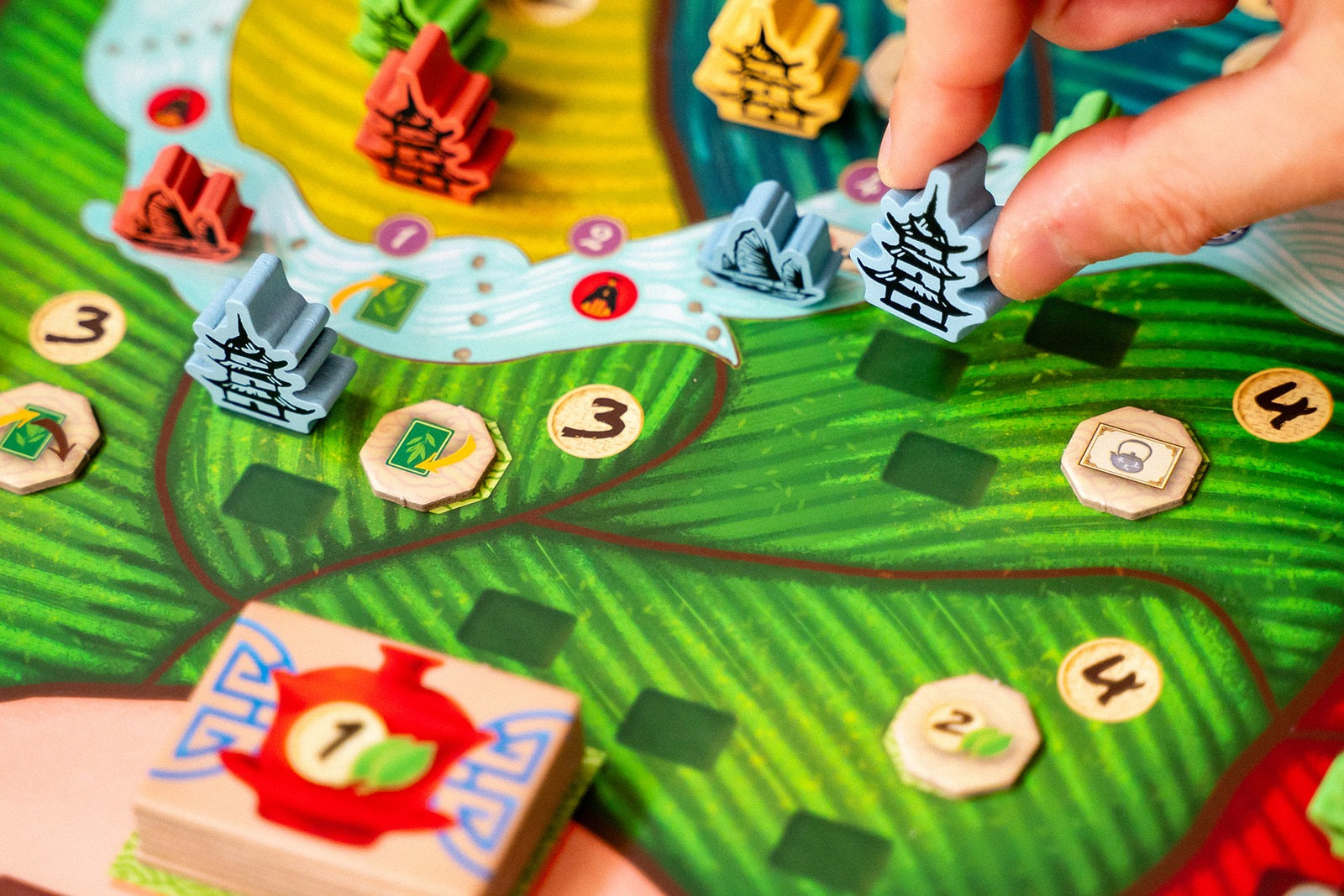 With your cards, you will build new tea gardens, acquire new cards, trade your tea with eager caravans, ferment your tea leaves, and harvest more tea. Couple your main actions with the power of secondary actions to navigate the river, produce tea cups, or practice tea studies at the university.