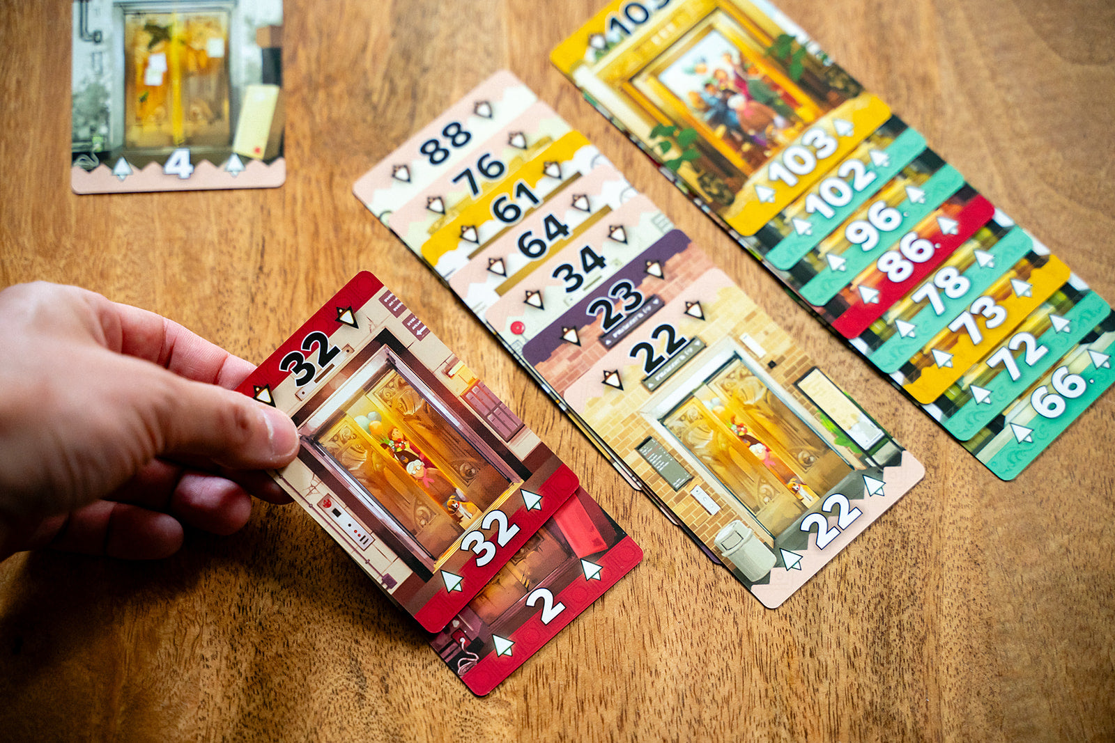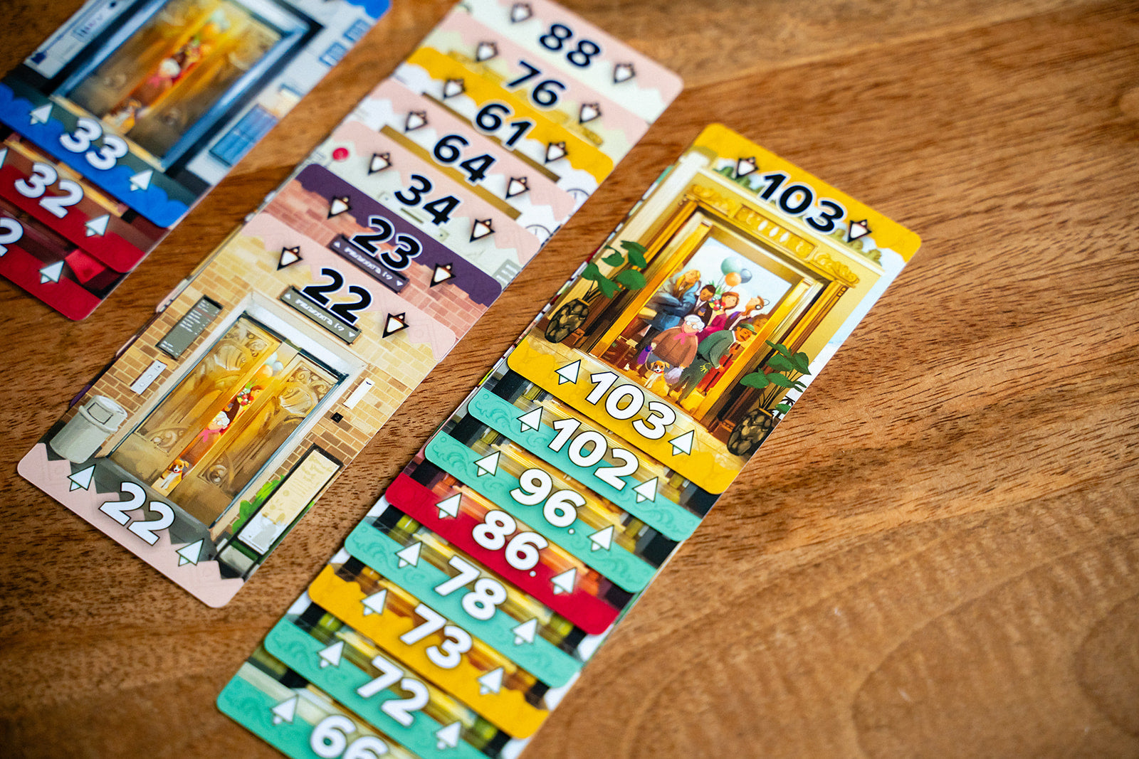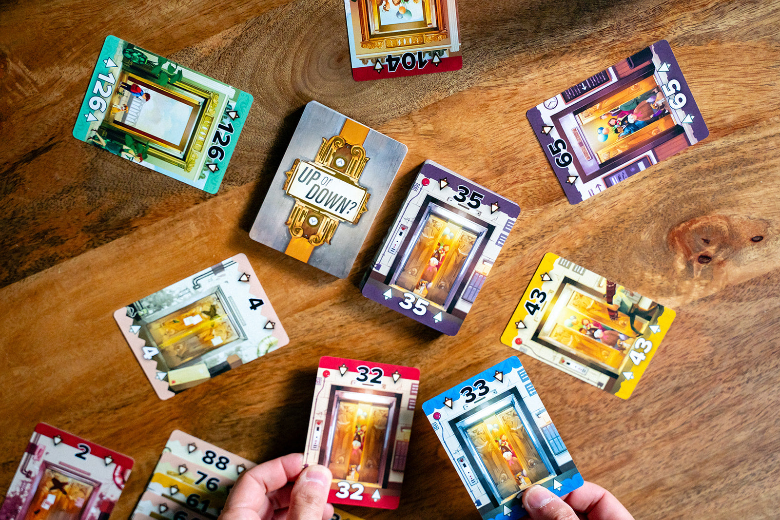 In Up or Down? players build ascending and descending columns of cards that score points at the end of the game. The more cards of the same color in a column, the more points you will score. The person with the most points at the end of the game wins!